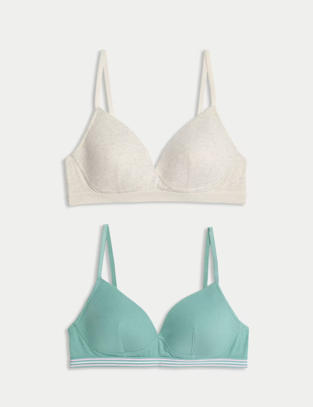 Made from super-soft cotton-rich material with a ribbed finish, these bras from our M&S Collection range have a sporty look. The perfect first bra, they're specially designed with comfy, non-wired cups to support a growing shape. Light padding ensures a smooth look under clothes. Comes in a handy pack of two in different colours. M&S Collection Bras: simple and supportive bras specially designed for pre-teens.