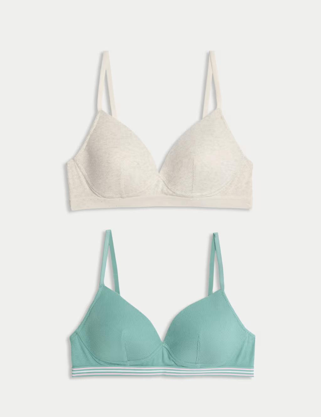 Made from super-soft cotton-rich material with a ribbed finish, these bras from our M&S Collection range have a sporty look. The perfect first bra, they're specially designed with comfy, non-wired cups to support a growing shape. Light padding ensures a smooth look under clothes. Comes in a handy pack of two in different colours. M&S Collection Bras: simple and supportive bras specially designed for pre-teens.