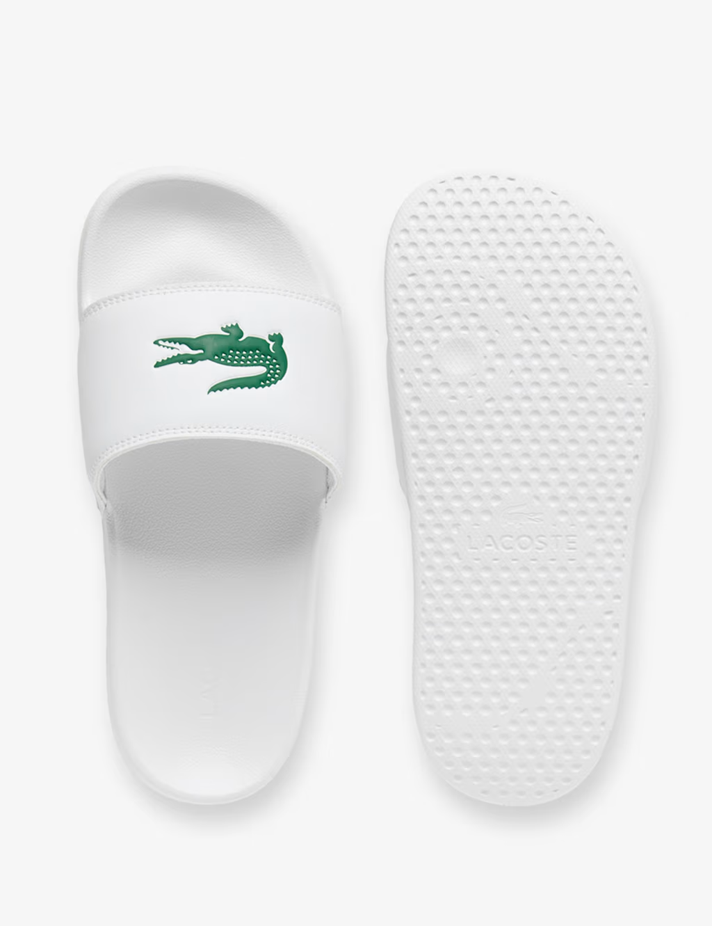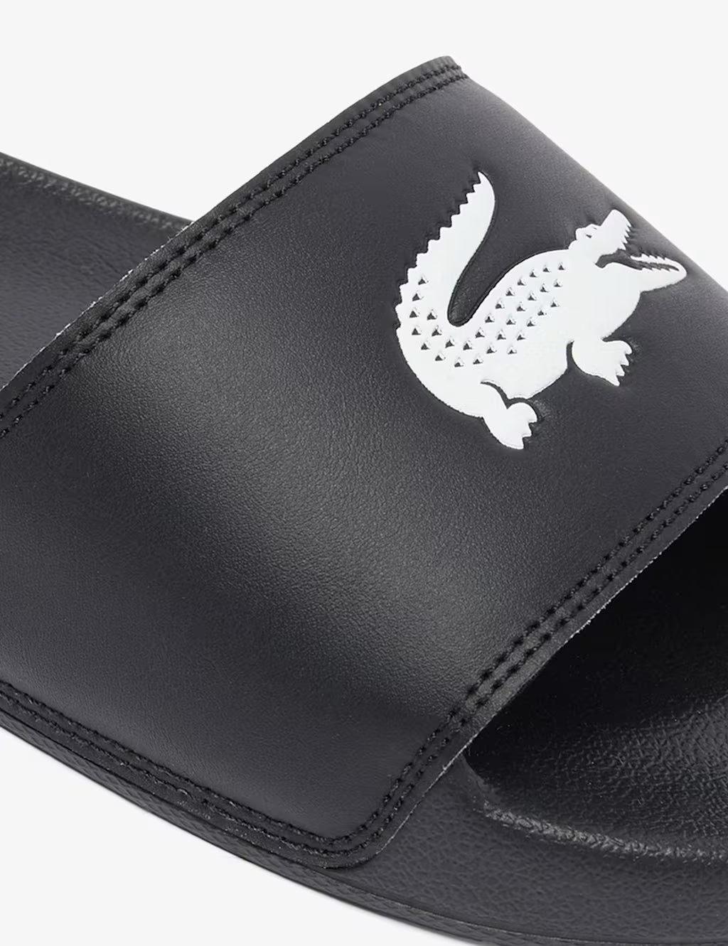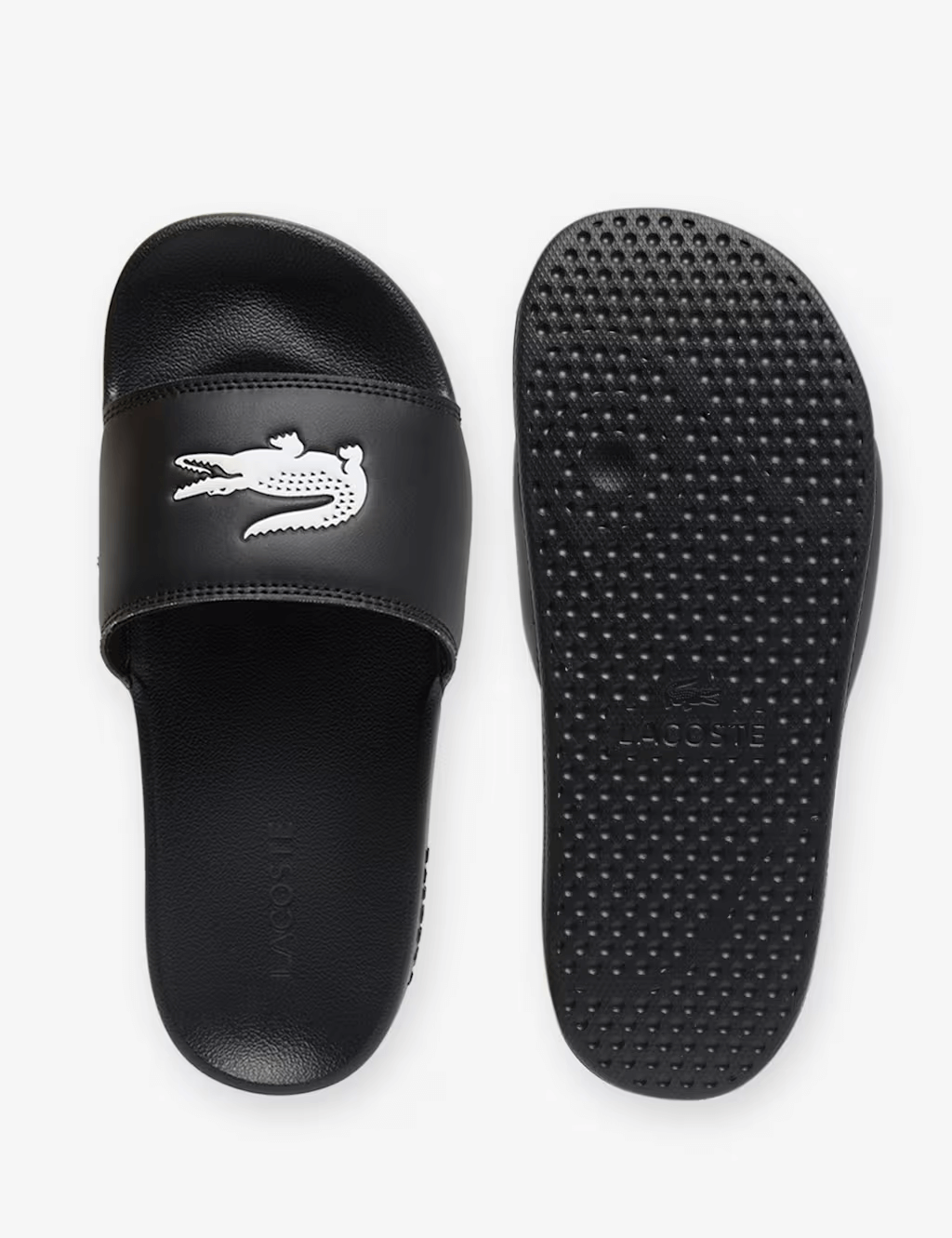 These sleek sliders by Lacoste are made from leather, making them a luxe choice for those off-duty days. The classic slip-on design has flat soles and gently contoured footbeds for comfortable wear. The wide straps feature tonal stitched detailing and the brand's iconic crocodile logo for a statement finish.
