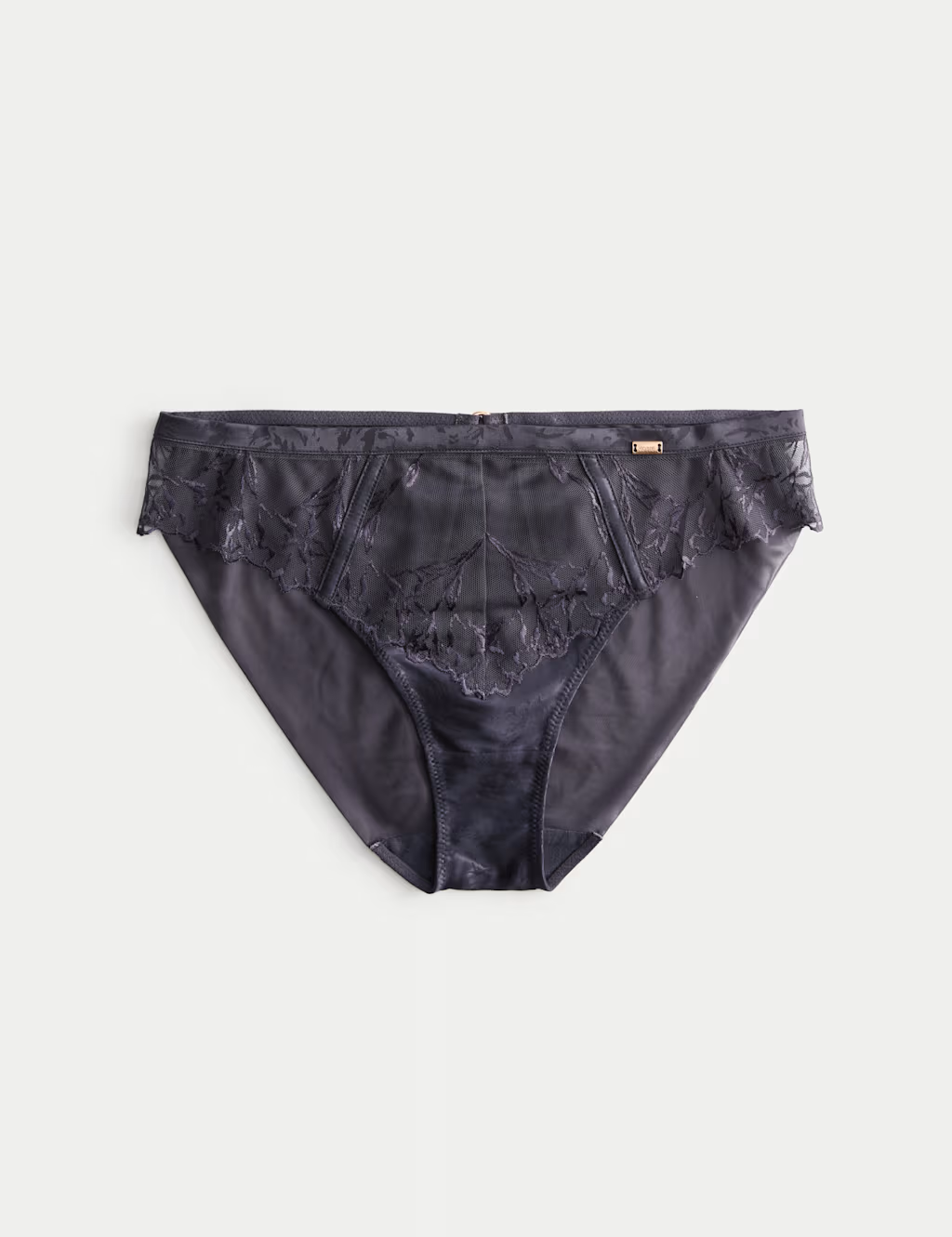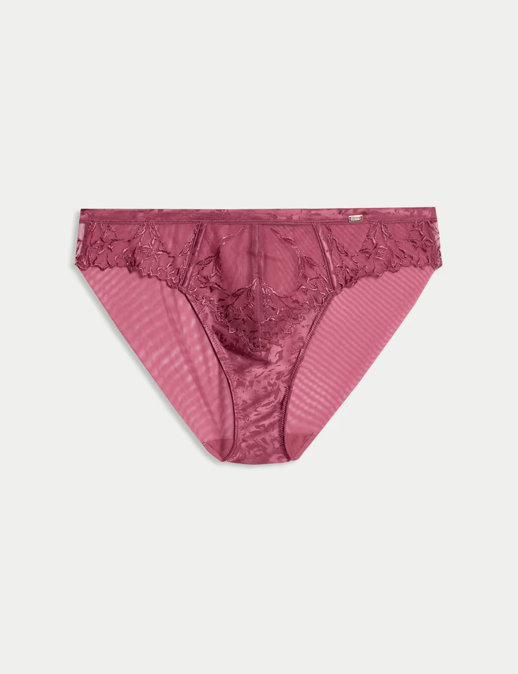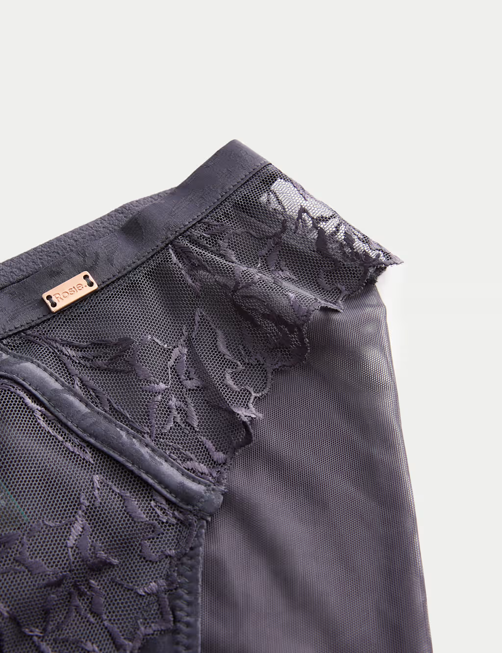 Bring an elevated feel to your lingerie with these knickers created by Rosie Exclusively for M&S. They're cut in a flattering high-leg shape, with a high-rise waistline. The Swiss designed floral embroidery shows delicate lisianthus blooms and is complemented by luxurious satin jacquard. Exclusively designed signature rose gold hardware adds a refined finishing touch. Rosie: contemporary, feminine silhouettes crafted from luxurious fabrics with intricate detailing.