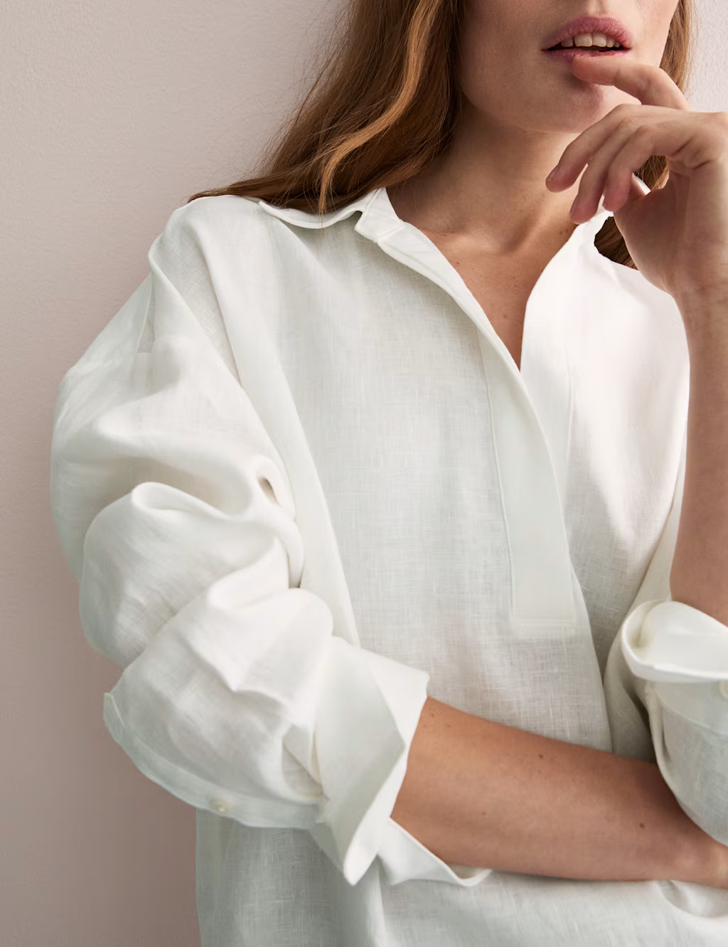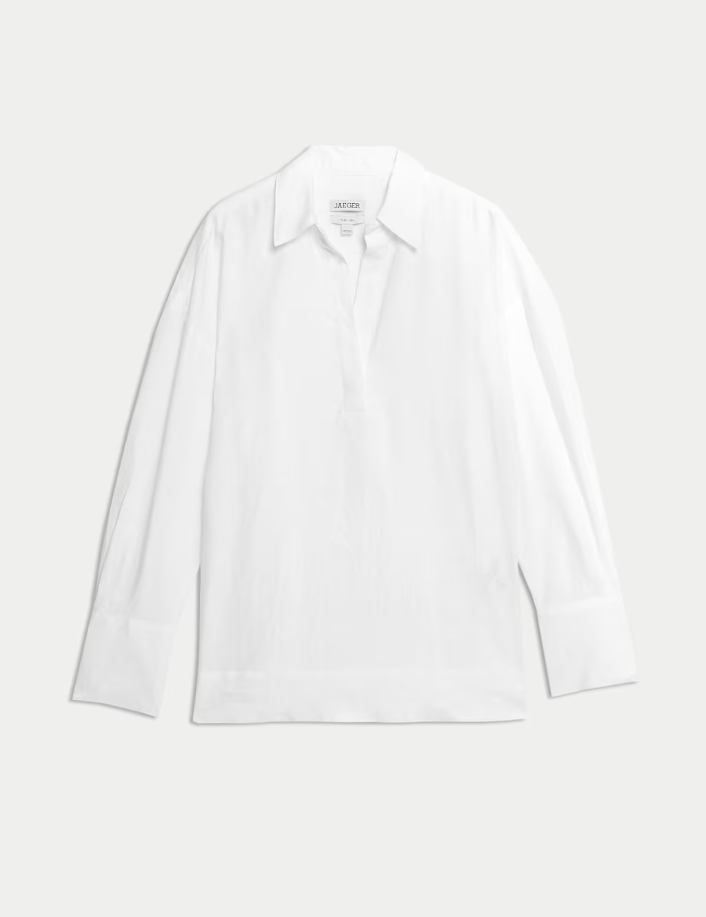 Crafted from pure linen for a breathable feel, this Jaeger tunic is a luxurious take on a wear-everywhere staple. It's cut to a roomy relaxed shape and can be pulled on over the head for ease. A collar gives a traditional finish. Pair with wide-legged jeans for an easygoing look.
