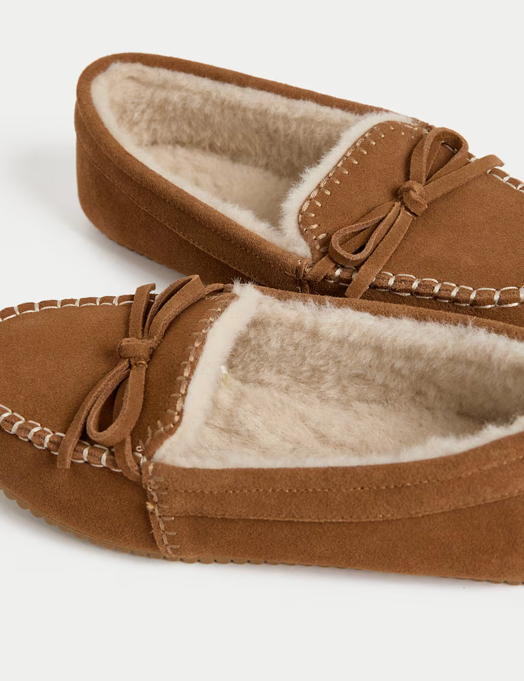 These suede moccasin slippers are a timeless choice for lounging around the house. The slip-on design features a cosy faux fur lining and a flat sole with added grips for extra traction. Stitch detailing on the front and a neat bow add the finishing touches. M&S Collection: easy-to-wear wardrobe staples that combine classic and contemporary styles.